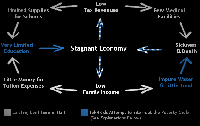 Now return to the graphic above. Haitian students who succeed in mastering the technological education provided by Tek4Kids and our partner schools become agents acting against other stages in the Haitian poverty cycle. Successful graduates become employable. Employed citizens are able to financially care for their own children and families, from food to health care. Employed citizens are able to pay taxes to provide public services. Citizens both educated and employed have higher expectations for clean water, essentials for life, and better schools.