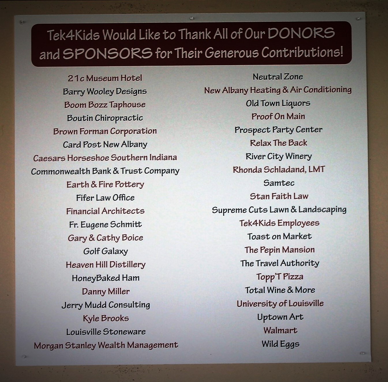 Silent auction items were donated by the following: 21c Museum Hotel and Proof on Main, Brown Forman, Caesars Horseshoe Casino, Data-Strategy Employees, Earth & Fire Pottery, Hallmark Card Post, Danny Miller & Kyle Brooks, Heaven Hill Distilleries, Louisville Stoneware, Neutral Zone, Old Town Liiqours, Prospect Party Center, Relax The Back, Rhonda Schlandand, River City Winery, The Pepin Mansion, Total Wine & More, University of Louisville and Uptown Art.