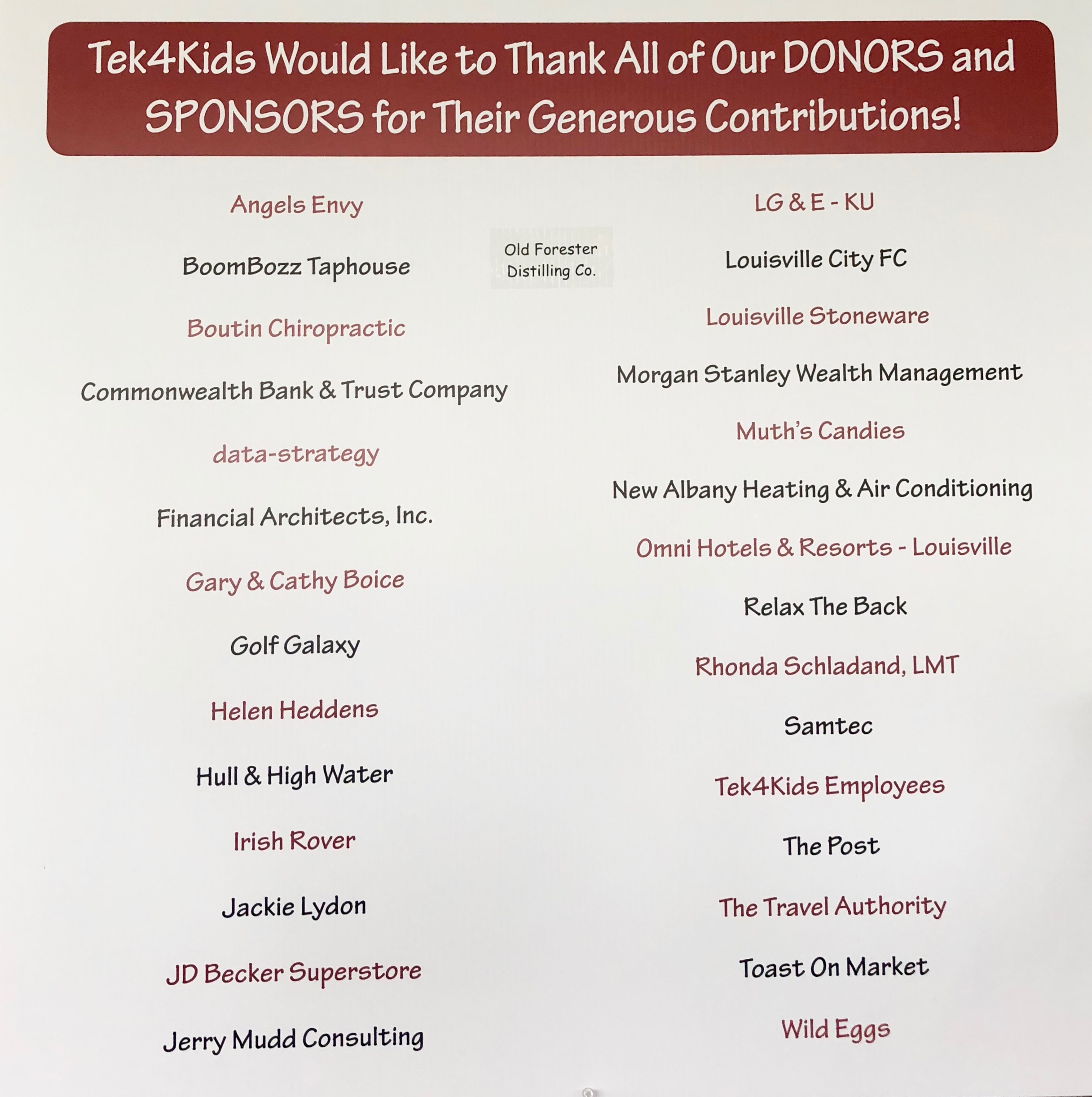 Silent auction items were donated by the following: Angels Envy, Boombozz Pizza & Taphouse, JD Becker Superstore, Helen Heddens, Hull & High Water, Irish Rover, Jackie Lydon, Louisville City FC, Louisville Stoneware, Muth’s Candies, Shalimar, Old Forester Distilling Company, Omni Hotels & Resorts, Relax The Back, Rhonda Schladand, LMT, Tek4Kids Employees, Toast On Market, The Post and Wild Eggs.